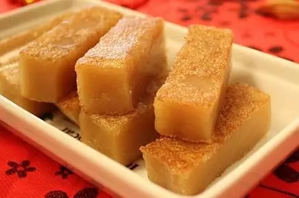 年糕:又稱粘粘糕,取年年高之意。在南方用糯米制成,年糕北方則為黏黍。年糕的歷史悠久,漢朝的米糕已有“稻餅”、“糕”、“餌”、“糍”等名稱。6世紀食譜《食次》就有年糕“白繭糖”的制法,北朝《齊民要術(shù)》記載了將米磨成粉制糕的方法。元旦吃年糕盛行于明清時代,尤以南方流行。明末《帝京景物略》卷二記載,正月元旦,“夙興盥激,吃棗糕,日年年糕”。北方河北嘉靖時《威縣志》說當?shù)爻浴罢粞蚋狻?。在南方,江浙的蘇州、嘉定等地方志稱“節(jié)糕”,明正德廣東《瓊臺志》記載當?shù)爻源焊猓骸霸┣耙耘捶蹪?jí)蔗糖或灰汁籠蒸春糕,圍徑尺許,厚五六寸,雜諸果品歲祀,遞割為年茶,以相饋答?!逼湫沃祁愃平裉斓纳盏案?。清顧祿《清嘉錄》卷十二記載更為詳細,說將黍粉和糖為糕,叫做“年糕”,有黃色和白色之別。大的一尺見方為“方頭糕”,還有像元寶的“糕元寶”,用于除夕供先、親戚朋友間的贈答。此外,還有細長的“條頭糕”、寬大的“條半糕”。過節(jié)時富家雇人制糕,一般人可在糕店購買。